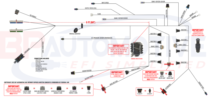 Our LS swap harnesses also require the removal of the VATS and emissions systems from the PCM. This harness also requires the use of a Blue and Green P59 PCM service numbers will vary, which can be purchased from BP Automotive. This application uses an Electronic Automatic Transmission applications which will also require a double pole brake switch for converter lock-up control. This can also be purchased from BP Automotive by selecting yes in the drop-down when purchasing your harness.