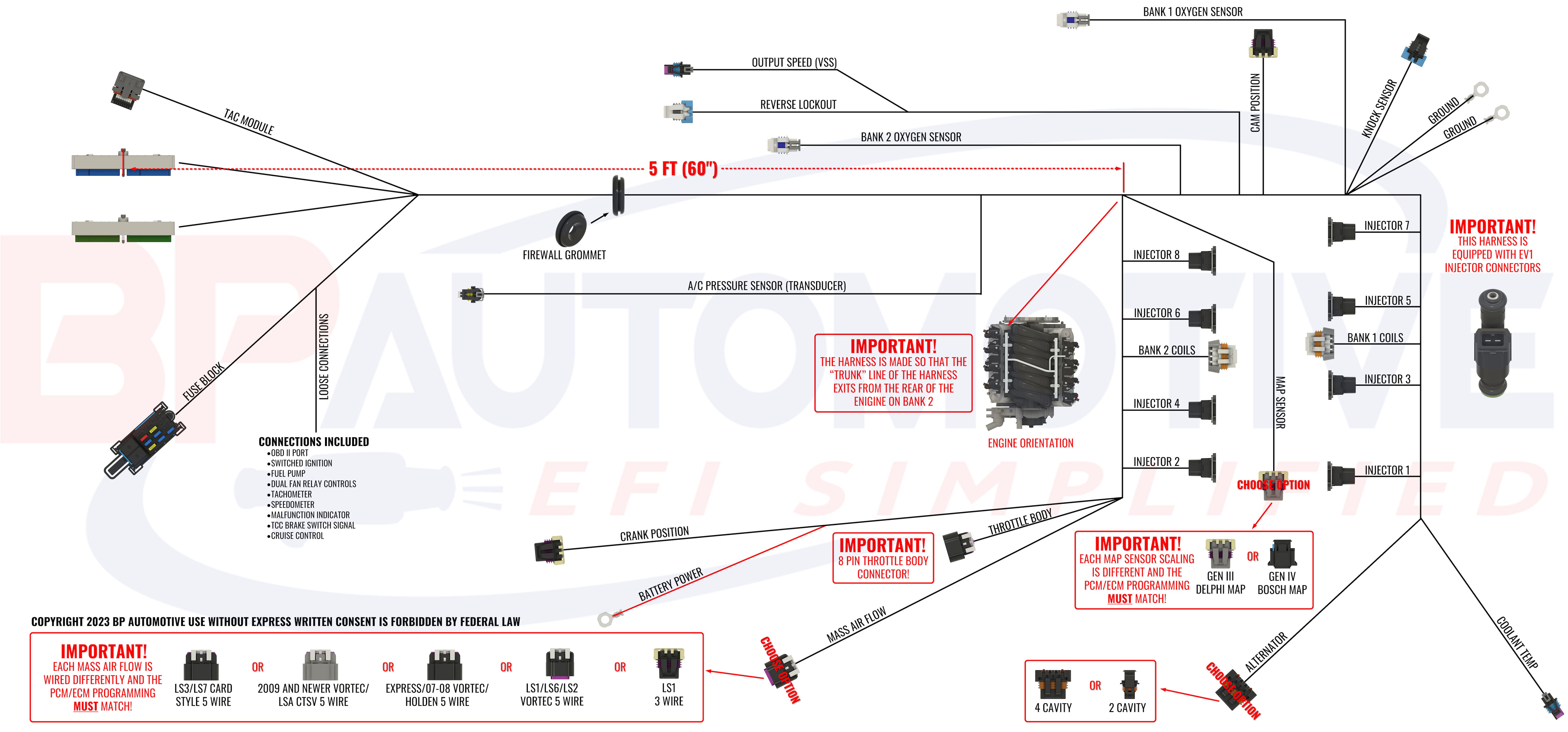 Our LS swap harnesses also require the removal of the VATS and emissions systems from the PCM. This harness also requires the use of a Blue and Green P59 PCM service numbers will vary, which can be purchased from BP Automotive.