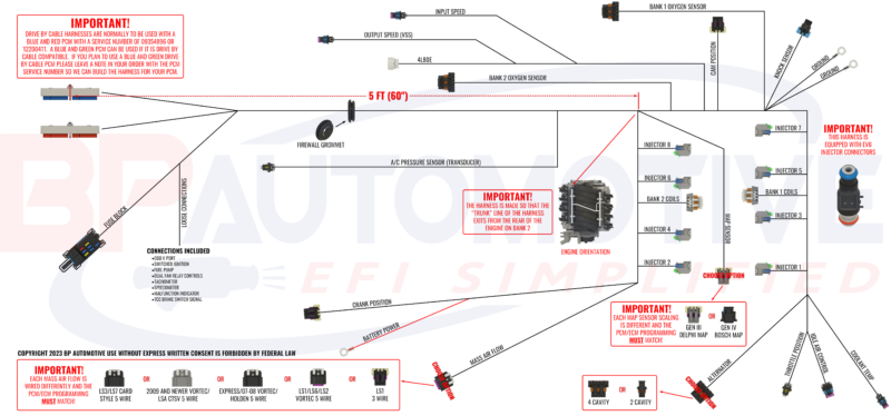 Our LS swap harnesses also require the removal of the VATS and emissions systems from the PCM. This harness also requires the use of a Red and Blue PCM service numbers 12200411 or 9354896, which can be purchased from BP Automotive. This application uses an Electronic Automatic Transmission applications which will also require a double pole brake switch for converter lock-up control. This can also be purchased from BP Automotive by selecting yes in the drop-down when purchasing your harness.
