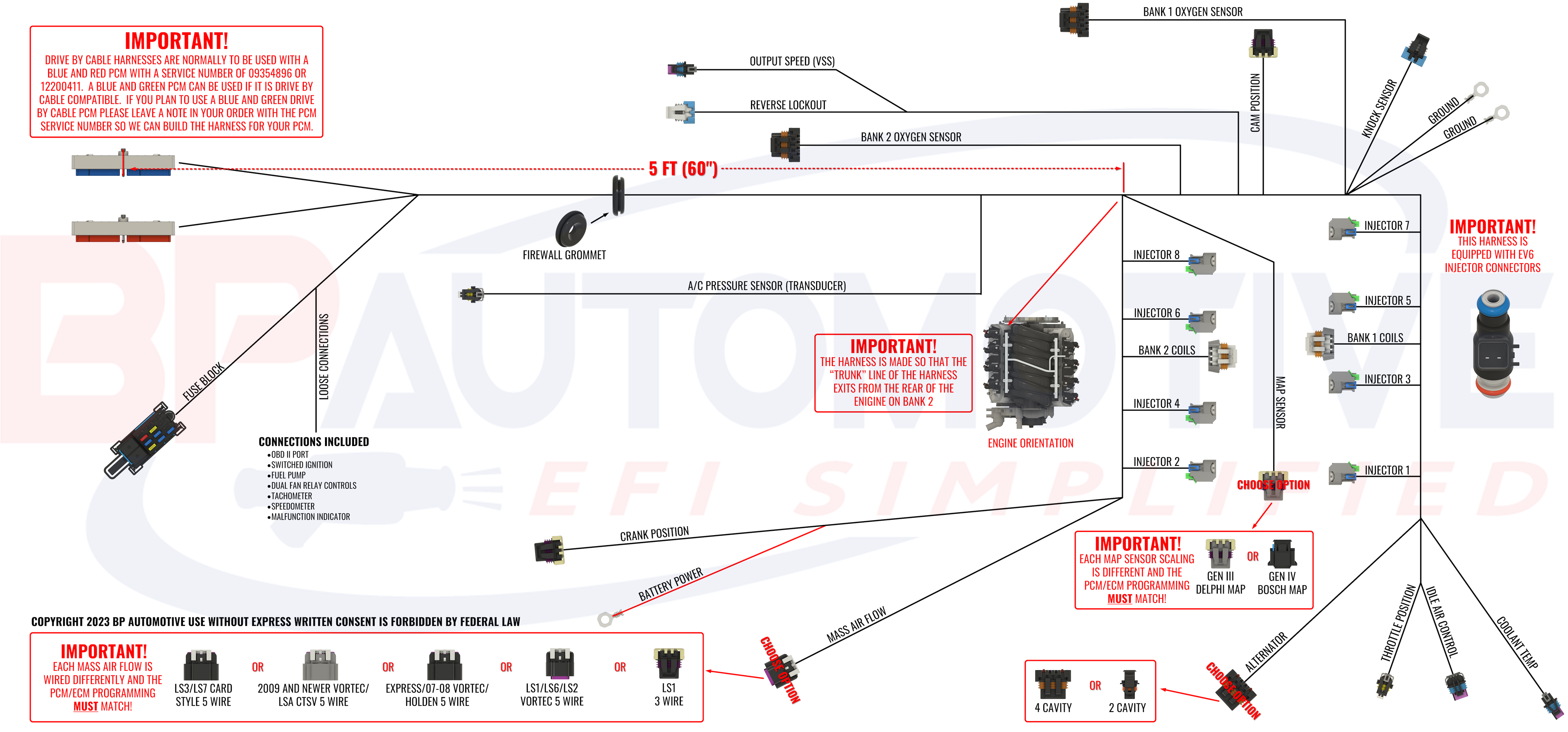 Our LS swap harnesses also require the removal of the VATS and emissions systems from the PCM. This harness also requires the use of a Red and Blue PCM service numbers 12200411 or 9354896, which can be purchased from BP Automotive.
